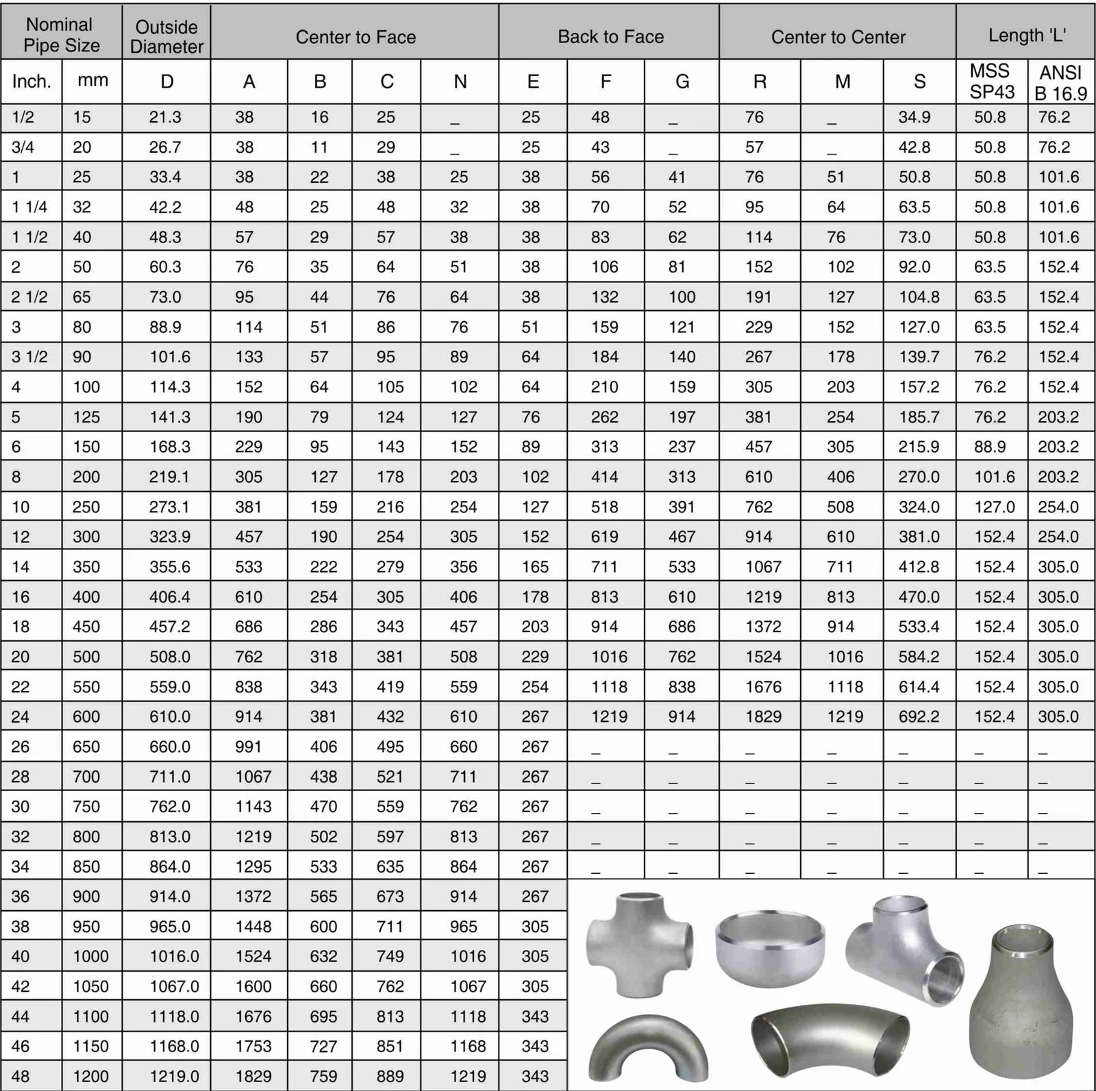 15 NB UP TO 1200 NB IN SCH 5S, 10S, 10, 20, 40S, 40, STD, 60, 80S, 80, XS, 100, 120, 140, 160 & XXS |