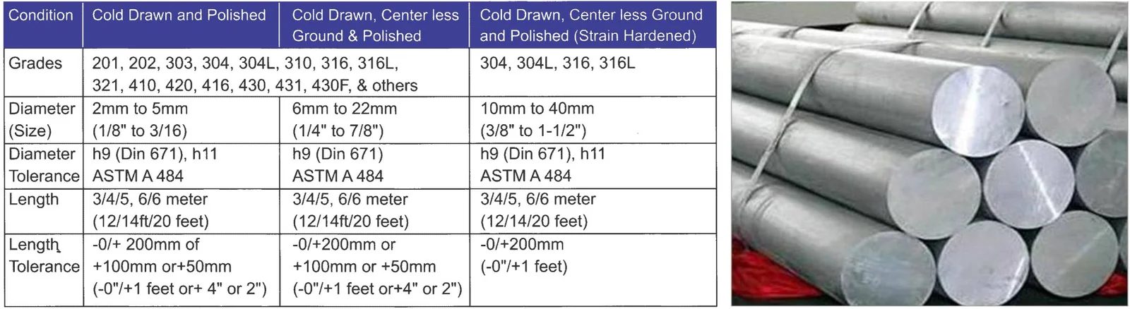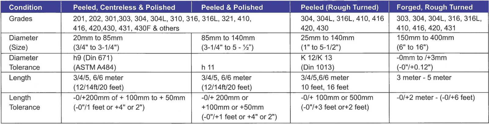 (ASTM / ASME SA 276) TP 304, 304L, 309S, 309H, 310S, 316, 316L, 316 TI, 317, 321, 347, 410, 420, 430, 431, 440A, 440B, 440C, 446